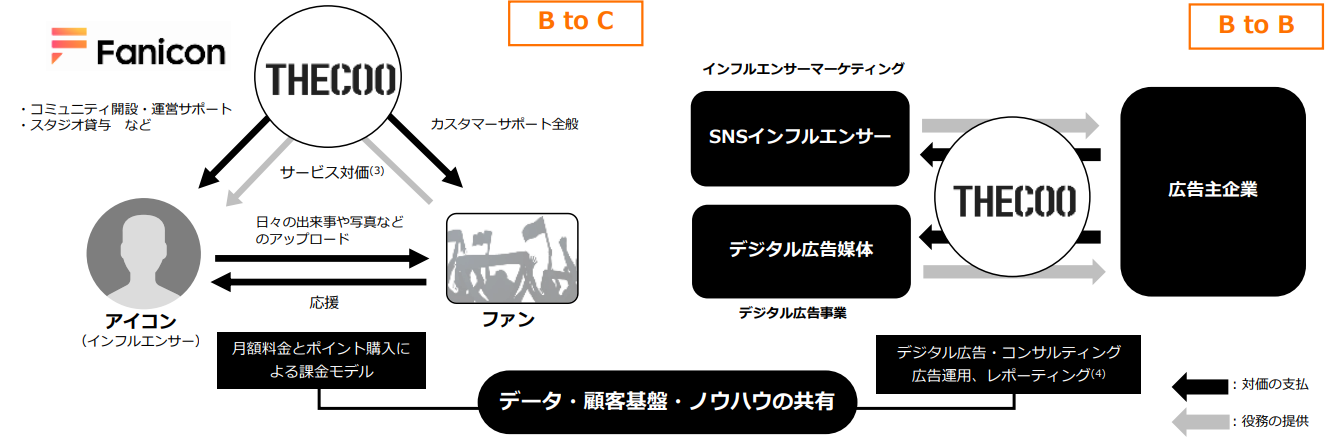 WEB、Android、iOSで提供しているファンビジネスプラットフォーム「Fanicon」を運営する「ファンビジネスプラットフォーム事業」、及びYouTuberやインスタグラマー等を活用したマーケティング支援を行う「インフルエンサーセールス事業」と運用型広告のコンサルティングを行う「デジタル広告事業」などを提供する「デジタルマーケティング事業」を展開している。