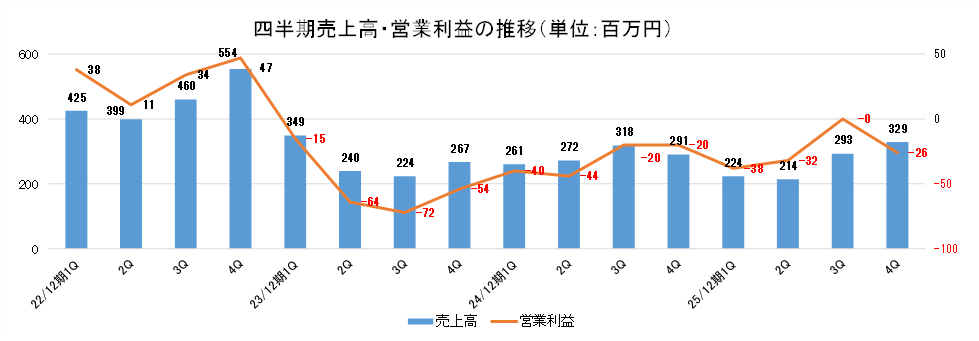 営業損失が続いていたが、23/12期4Qをボトムとした改善傾向が継続している。25/12期は四半期ごとに売上をしっかりと伸ばし、成長投資で4Qは3Q比で若干減少したが利益も拡大傾向にある。