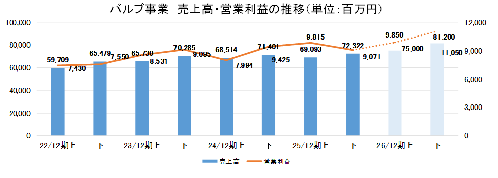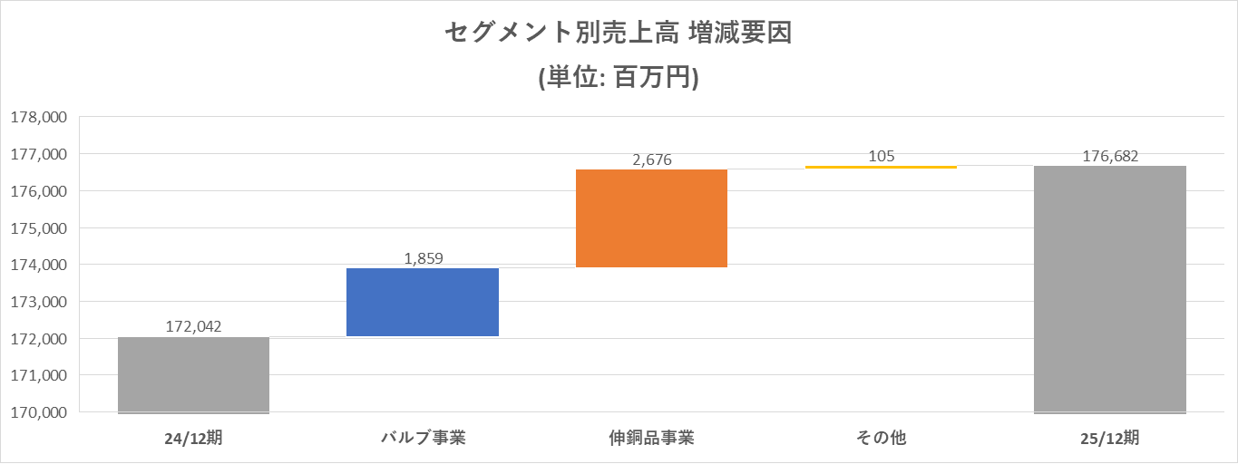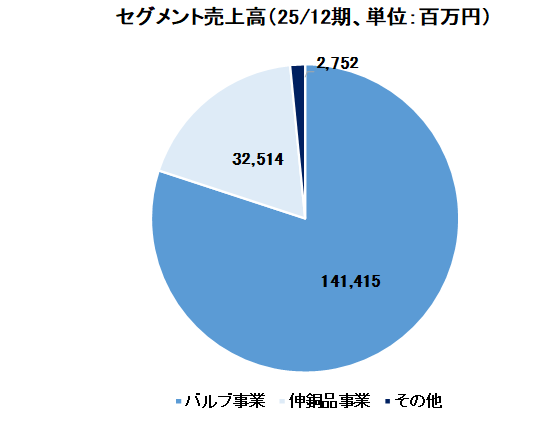 事業は、バルブ事業、伸銅品事業、及びホテル・レストランの経営(ホテル事業)等のその他に分かれ、25/12期の売上構成比は、それぞれ80.0%、18.4%、1.6%。なお、伸銅品事業は26/12期よりメタルソリューション(メタルS)事業へ名称変更する。