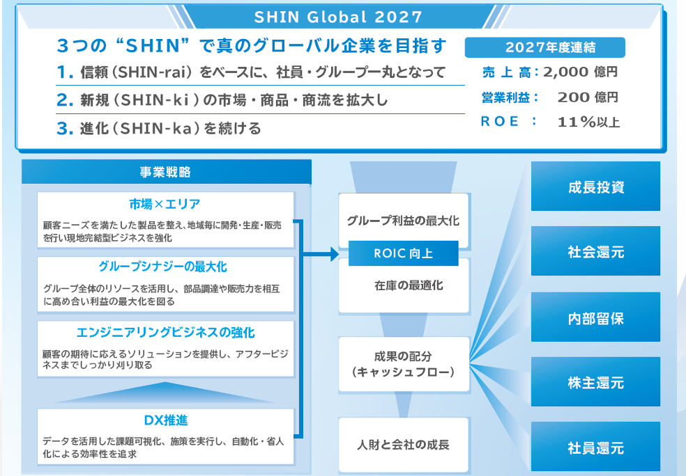 - 新たな中期経営計画“SHIN GLOBAL 2027”が25/12期からスタートしている。3つの“SHIN”で真のグローバル企業を目指し、27/12期に売上高2,000億円、営業利益200億円、ROE11%以上を目標に置いた。CO2削減率▲90%や社員エンゲージメント、女性管理職比率などの非財務KPI目標も打ち出している。なお、配当性向を従来の35%前後から40%以上に引き上げている。
