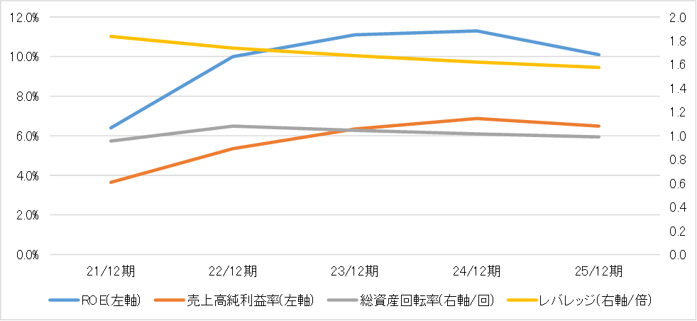 25/12期のROEは10.1%となり、前期からは低下したものの4期連続で2ケタをしっかりと確保した。30/12期には13%以上を目指しており株主価値(PBR)を継続して向上させる考え。
