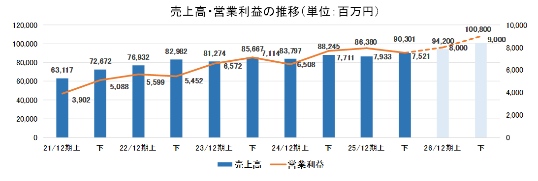 営業利益は前期比8.7%増の154億54百万円。バルブ事業は特に海外市場での販売量の増加に伴う増収効果等により同8.4%の増益。伸銅品事業は、1Qでの計画的な炉の補修等による修繕費増加の影響が残り2.4%減益となった。営業外では保険収入が増加した反面、前期の為替差益が為替差損に転じたこともあり経常利益は同5.2%増の160億71万円。前期は大規模な政策保有株式の売却を行ったが25/12期にはそのような売却益がなくなったことで、当期純利益は同3.0%減の114億65百万円。