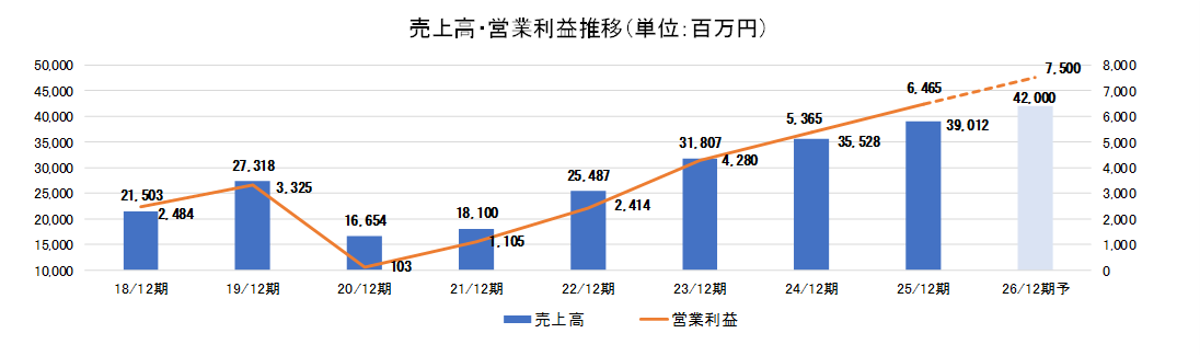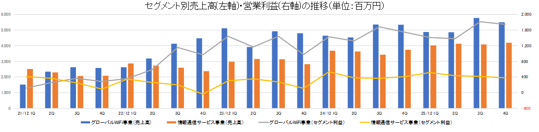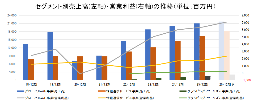 - 25/12期は売上高・各段階利益で過去最高を更新。概ね会社予想の水準で着地し、コロナ禍以後の急回復から成長軌道に着実に乗っている。26/12期もしっかりと連続の2桁増益予想。目を引くのが、グローバルWiFi事業と情報通信サービス事業におけるストック収益の着実な拡大。長期にわたる安定した収益基盤がしっかりと構築されている。グローバルWiFi事業ではニューヨークに子会社を設立しており、今後の展開には注目したい。また、いずれの事業においても随時新サービスの投入やリニューアルも行っており、新規顧客獲得だけではなく既存顧客へのサービス拡充もしっかり。また、売上だけでなくコスト面においてもAI・RPAを用いて業務を効率化させてしっかりと利益率を確保している。中期経営計画では売上高を下方修正しつつも営業利益・純利益は据え置いており、足元で収益性の向上が見えてきていることも分かる。PERは低位にとどまっている。高い配当利回りを確保できることにも妙味があり、今後見直しが進むだろう。