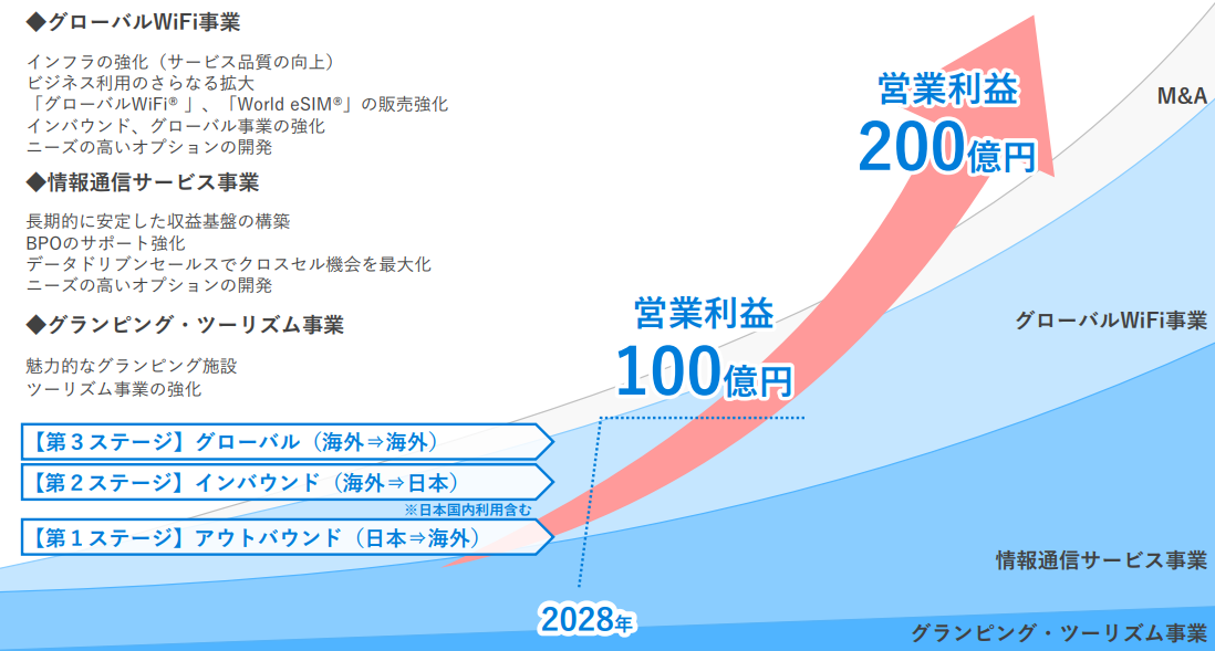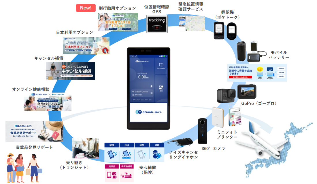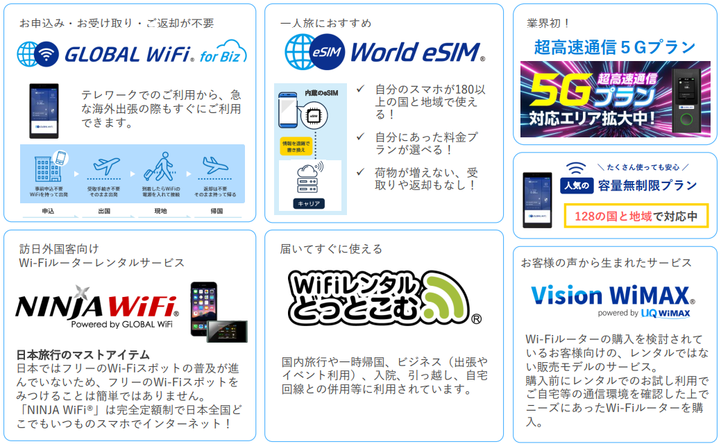 海外の通信会社と提携して、海外への渡航者に現地のインターネットサービスを安価で利用できるWi-Fiルーターをレンタルする「グローバルWiFi®」及び訪日外国人等へ日本国内で利用できるWi-Fiルーターをレンタルする「NINJA WiFi®」といったサービスを提供しており、進出先(韓国、台湾)において、海外to海外の渡航者向けサービスにも取り組んでいる。