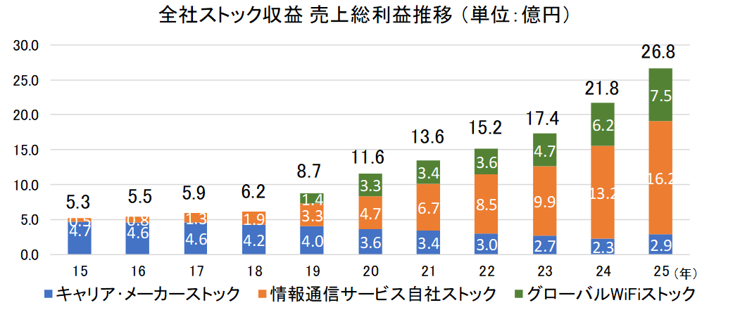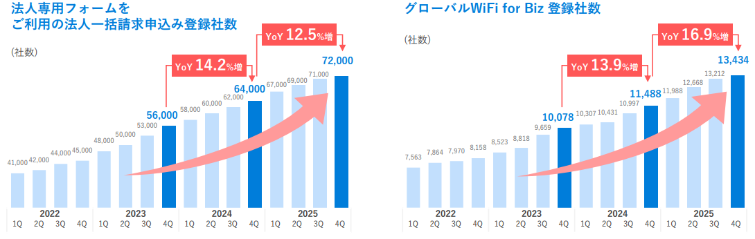 「グローバルWiFi®」及び「NINJA WiFi®」のサービス上の強みは、①国内携帯会社の定額割引との比較で最大89.9%のコストメリット(1日のレンタル料金が300円から)を有し、②業界最多クラスの200以上の国と地域をカバー。また、③世界中の通信事業者との提携による高速通信、④セキュア24時間365日サポート、⑤業界最多クラスの空港カウンター設置拠点数。⑥法人需要の取り込み力。これら強みにより、⑦Wi-Fiルーターレンタルサービスにおけるグループ全体の利用者数は2,400万人を突破した(26年1月同社調べ)。