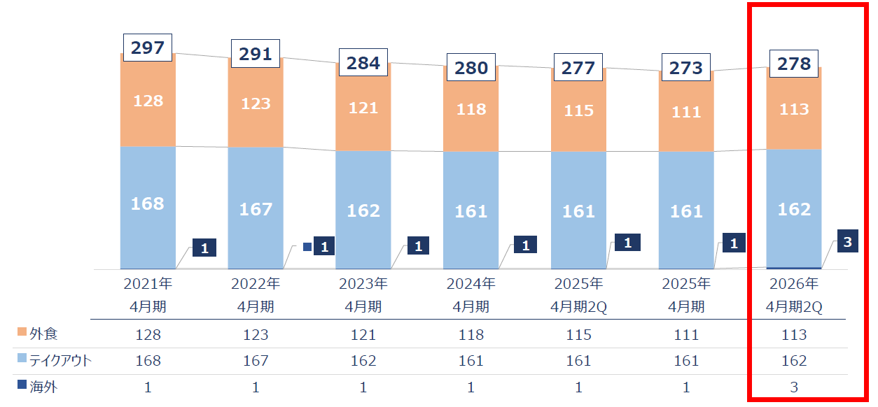 - 通期予想に修正はなく、26/4期は売上高が前期比0.9%増の297億13百万円、営業利益は同41.4%増の7億78百万円を見込む。米国の通商政策の影響による景気の下振れリスクや国内における原材料価格や光熱費の上昇が継続している。加えて人手不足等、先行き不透明な状況が続くことが予想される。こうした環境下、物価上昇の影響を考慮して賃上げを実施し、賃金上昇の好循環に対応するために販売価格改定と生産性の向上に取り組む。セントラルキッチンの生産性向上と収益向上にも注力する。期末配当も修正なく前期と同じ5.00円/株を予定する。