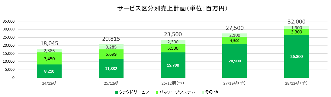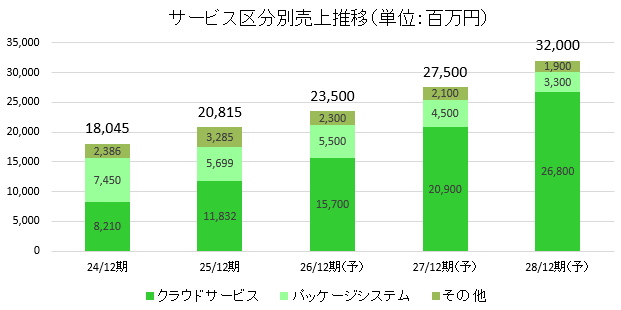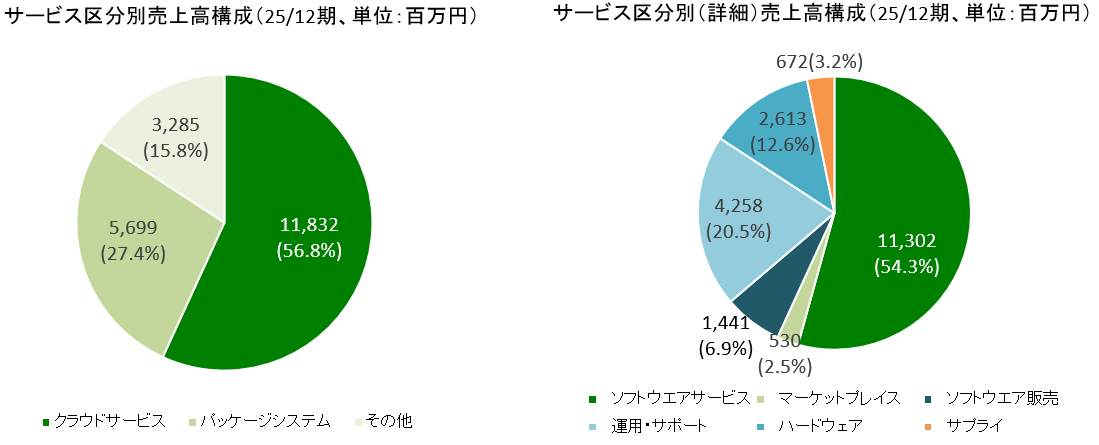 25年12月期の売上構成比は「クラウドサービス」56.8%、「パッケージシステム」27.4%、「その他」15.8%。