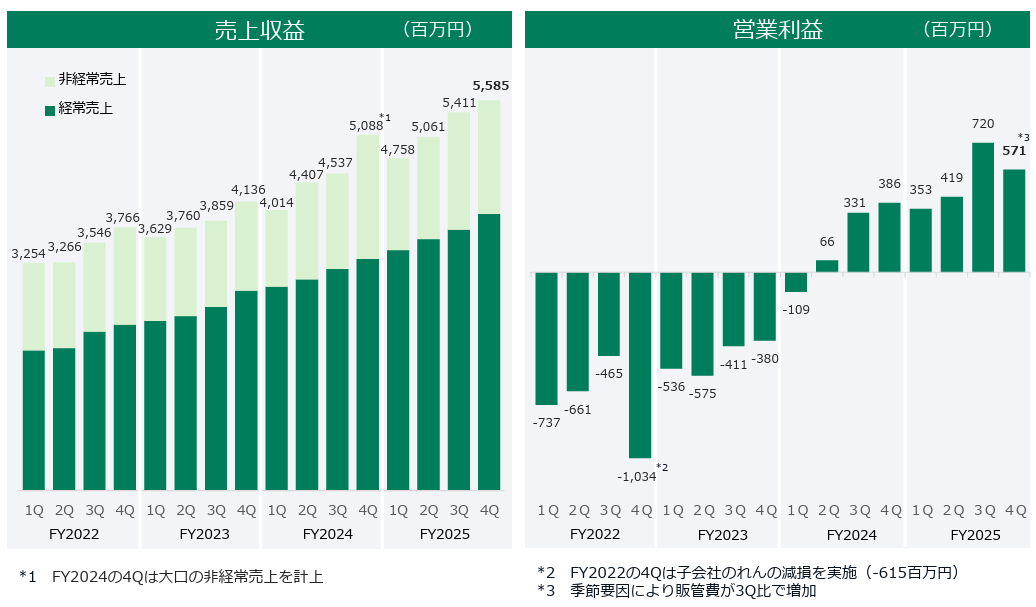 - 25年12月期の売上収益は前期比15.4%増の208億15百万円。月額サブスク型ソフトの契約数が増加しているほかPC買替需要が寄与した。営業利益は同206.0%増の20億63百万円。限界利益率が高い収益構造のため増収により大幅な増益となった。売上・利益とも上方修正後の業績予想を上回った。好調な業績を勘案し、年間配当を従来予想比1.00円/株増、前年比4.00円/株増の6.00円/株とした。