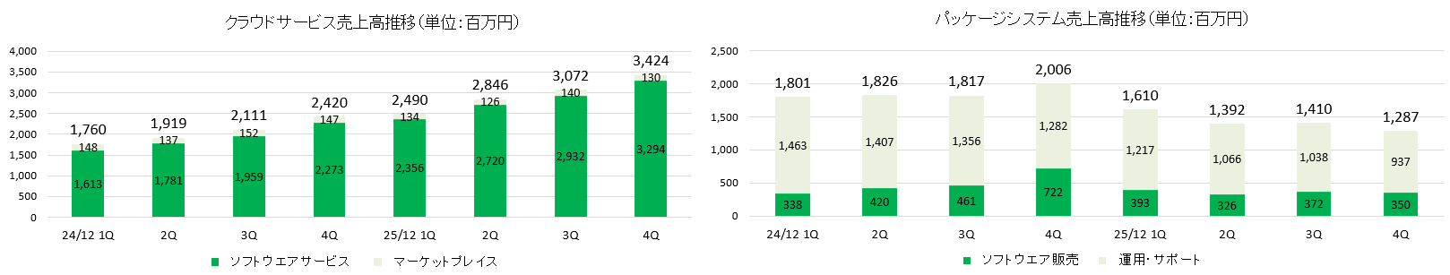 売上区分は、ソフトウェアサービスとマーケットプレイスから成る「クラウドサービス」、ソフトウェア販売と運用・サポートで構成される「パッケージシステム」、PC等のハードウェア類やサプライの販売により構成される「その他」に分類される。
