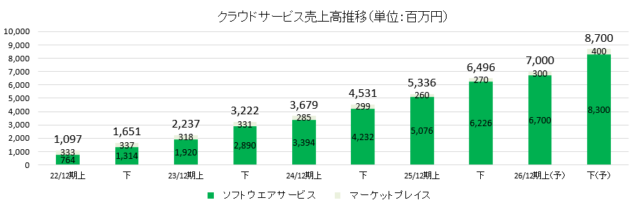 サブスクリプション型ソフトウェアに関わる売上「ソフトウェアサービス」と、受発注プラットフォームに関わる売上「マーケットプレイス」に大別される。