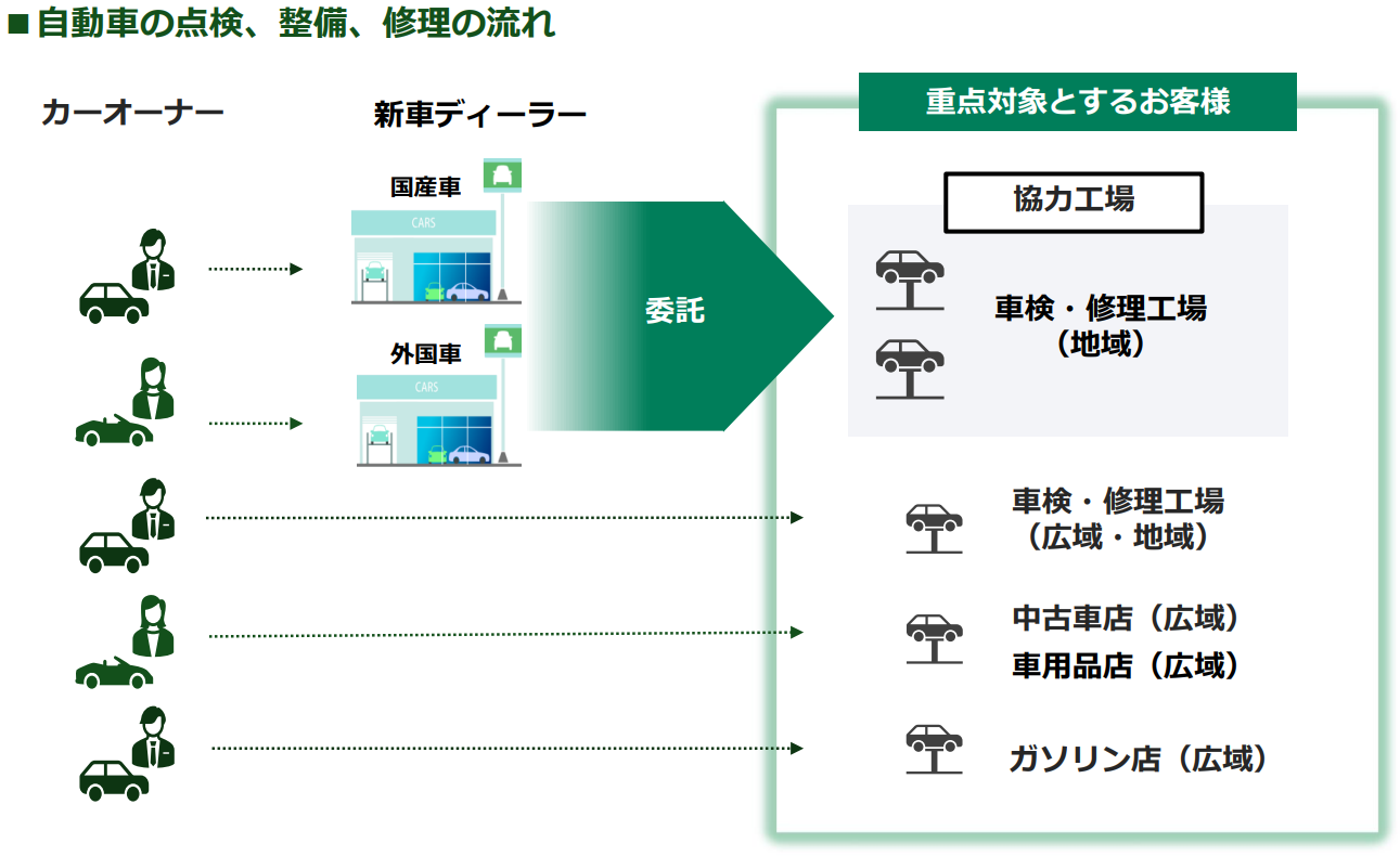 同社の顧客ターゲットの中心は、カーオーナーが自動車を購入した後の、給油、自動車アクセサリーの購入、車検、点検、部品交換、自動車の売却、廃棄処理などの様々なニーズに対応して製品やサービスを提供する「モビリティ産業」のプレーヤーである。
