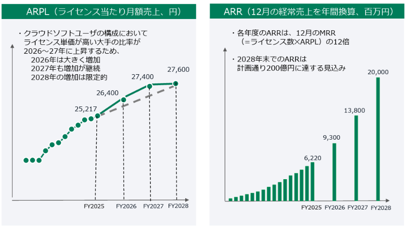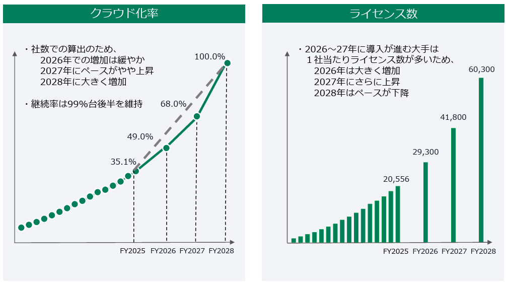 ソフトウェアサービス | 2026年以降、既存顧客のクラウド化を加速させる予定のため、ライセンス数の増加ペースは上昇する。 |