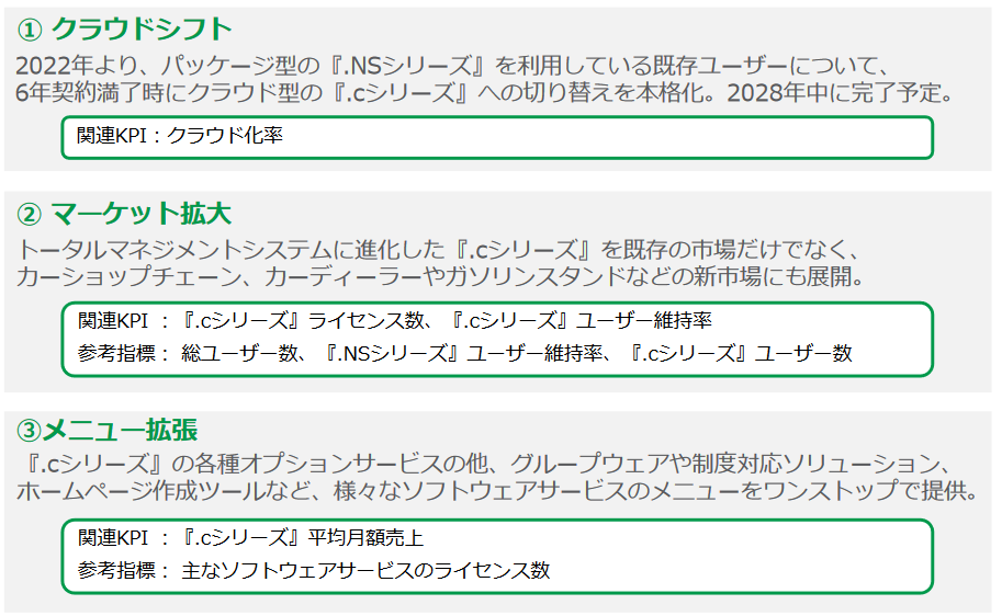 2022年12月期からは、ソフト販売のメイン商材を、従来ソフト「.NSシリーズ」から新しいクラウドソフト「.cシリーズ」に変更。従来ソフト「.NSシリーズ」を使用している顧客には6年のリース契約が満了となるタイミングで「.cシリーズ」の提供へ切り替えている。