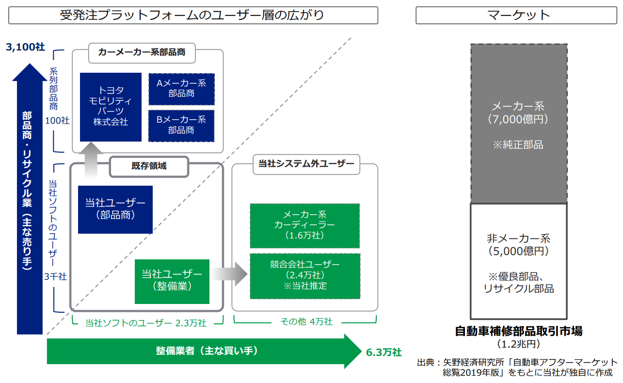 売り手については現在の主な売り手である部品商・リサイクル業者に加え、今後予定されている自動車メーカー系部品商社の参加は対象マーケットの拡大につながる重要なポイントと考えている。