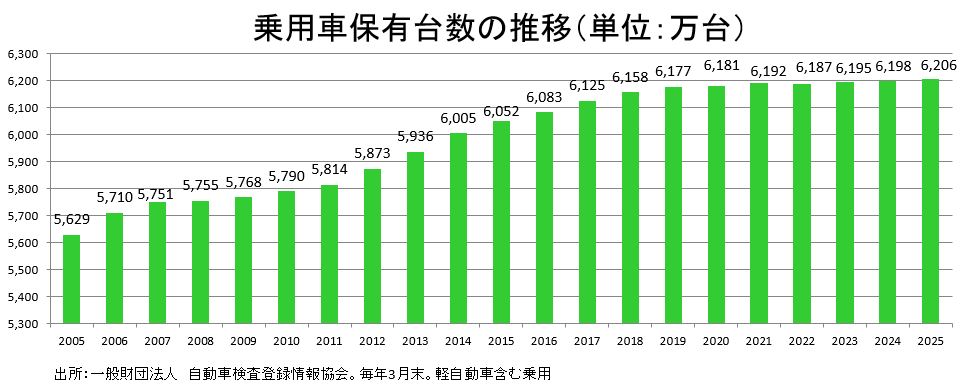 若者の自動車離れも言われているが、軽自動車を含む自動車保有台数(乗用車)は2025年3月末で約6,206万台と3年連続で過去最高を更新した。車両や部品の耐久性向上、安全装備の高度化により長期保有が進んでいることも背景にある。ストックである同台数は、今後も増加傾向が続くものと予想される。