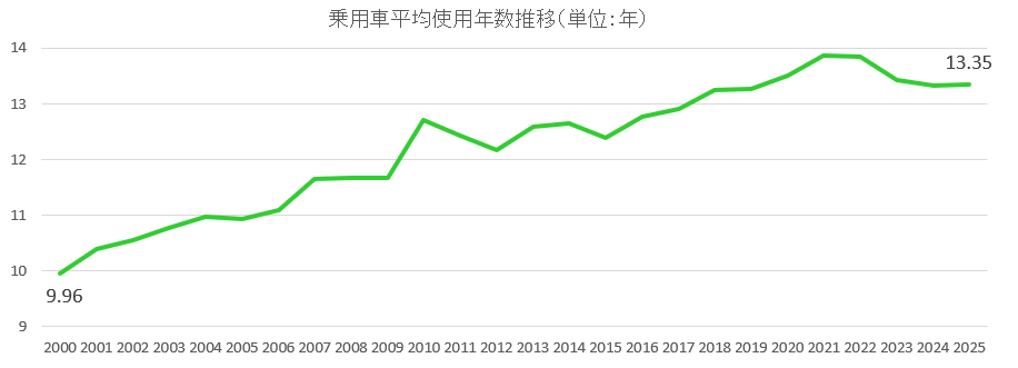 乗用車が初年度登録されてから抹消登録されるまでの平均年数である平均使用年数は2025年3月末で13.35年と前年を0.03年上回った。10年前の2015年比では、0.97年延びている(一般財団法人 自動車検査登録情報協会 統計情報より)。自動車の利用に対するユーザーの考え方の変化から長期使用車両が増えていることで、自動車整備市場や部品・用品市場においては、整備・点検需要や部品・消耗品の交換需要が拡大している。