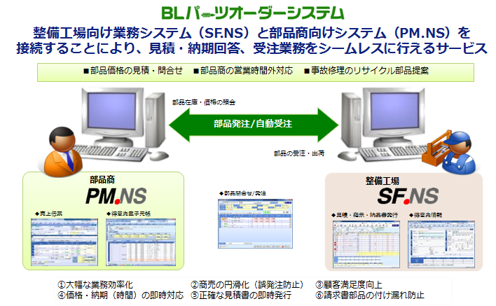 自動車補修部品の受発注プラットフォームは、自動車整備工場などが部品商と売買取引を行う場合や、部品商同士、あるいは自動車リサイクル業者と部品商などが売買取引する際に利用している。