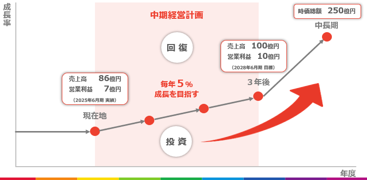 - 2028年6月期までの3ヵ年の中期経営計画においては、「コロナ禍以前のストック売上高成長率と営業利益率への回復」と「基盤システムの再構築、M&Aも含めた新たな事業創出への投資」の2点に重点を置き、3年後の2028年6月期「売上高100億円、営業利益10億円」を目標とする。中長期で時価総額250億円を超える企業集団を目指していく。