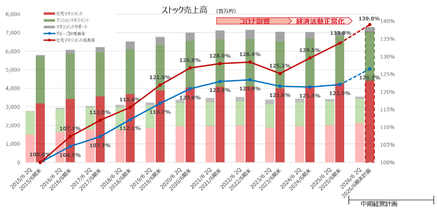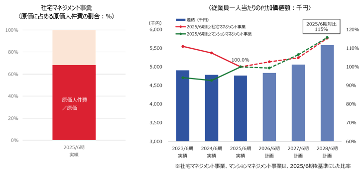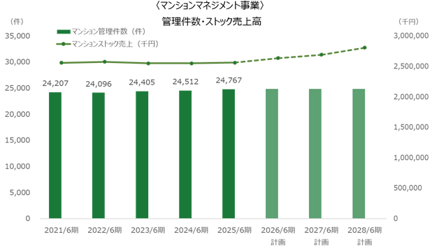 外部環境は年々厳しさを増している。最低賃金の上昇により、管理員や清掃員などのスタッフの人件費は年々上昇。また、工事費も上昇し、管理組合の支出は増加の一方である。住民の高齢化は進み、対処できない組合が自主管理へ移行する例も増えている。国土交通省の調査(「分譲マンションストック数の推移(2024(令和6)年末現在)」)によれば、2024年末のマンションストック総数は約713.1万戸と、潜在的な市場は大きいが、こうした環境下、後述するように同社では管理戸数の増大ではなく収益性の向上を目標としている。