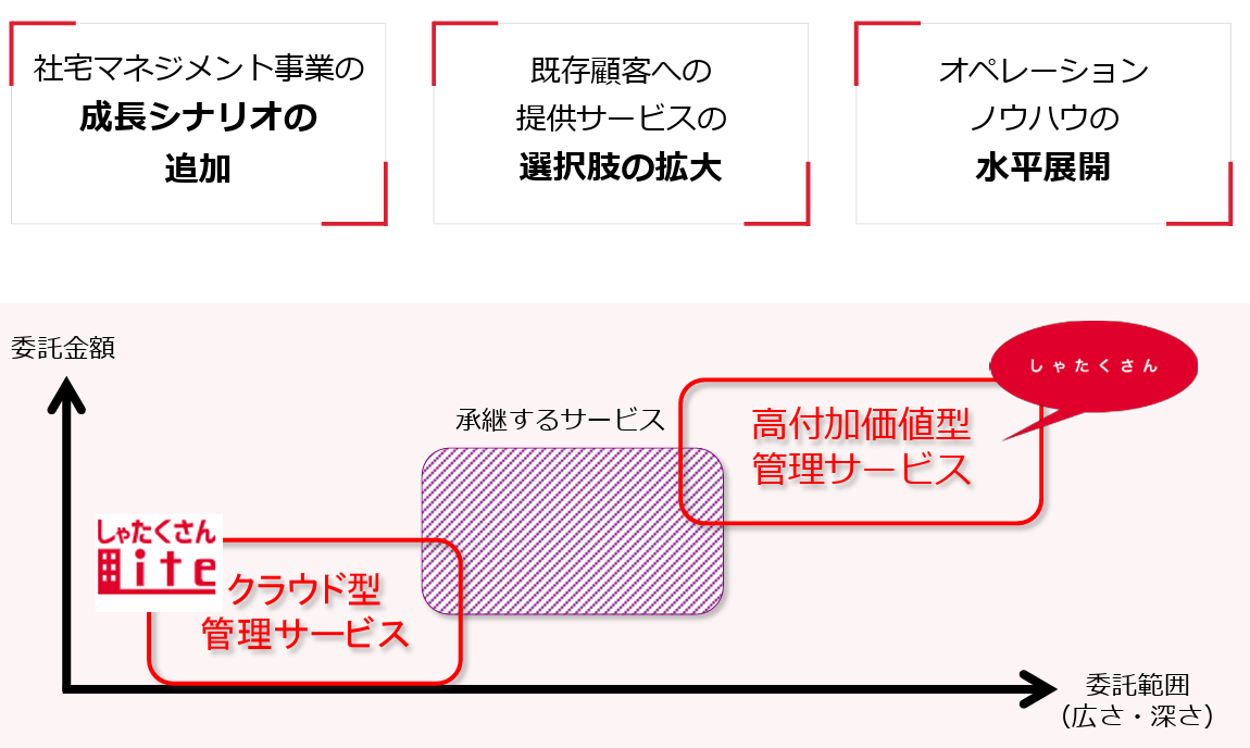 中心となる基盤事業は社宅管理事務代行とマンション管理の2つ。不動産仲介業やマンション分譲などの機能を持たないビジネスモデルにより、「お客様目線」での問題解決を行う独立系アウトソーシング企業であり、社宅管理事務アウトソーシング専業は同社のみ。ストック収入による安定した収益構造も強み。同社の他、社宅マネジメント事業を担う日本社宅サービス株式会社及びタスリンク株式会社、マンションマネジメント事業を展開するクラシテ株式会社及びクラシテ不動産株式会社、インキュベーション事業においてマネジメントサポート事業を提供する株式会社スリーSの全6社でグループを形成している。