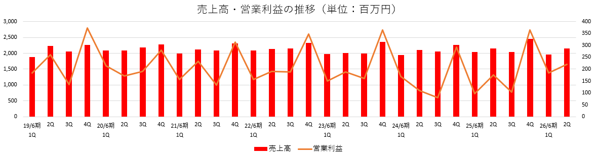 - 26年6月期上期は減収も大幅な増益。売上高は前年同期比1.8%減の41億21百万円。社宅マネジメント事業は増収も、マンションマネジメント事業は減収。ストック収入は順調に推移している。営業利益は同48.1%増の4億5百万円。売上総利益が同11.7%増加した一方、システム開発費用のほか一部経費が減少したため大幅増益となった。