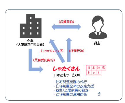 企業は競争力強化と効率性向上に向け、本業に人的リソースと時間を集中する必要がある。そこで、以上のように手間暇がかかり専門知識が必要とされる社宅事務業務全般の運営を企業の立場に立って代行するのが社宅管理事務代行サービス「しゃたくさん」である。同社は顧客企業と業務委託契約を締結し、企業と貸主の賃貸借契約に関し代理行為を行う。