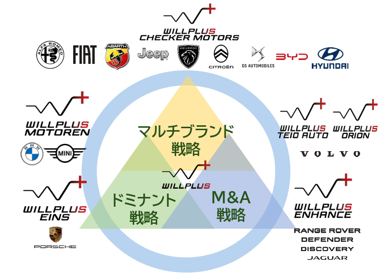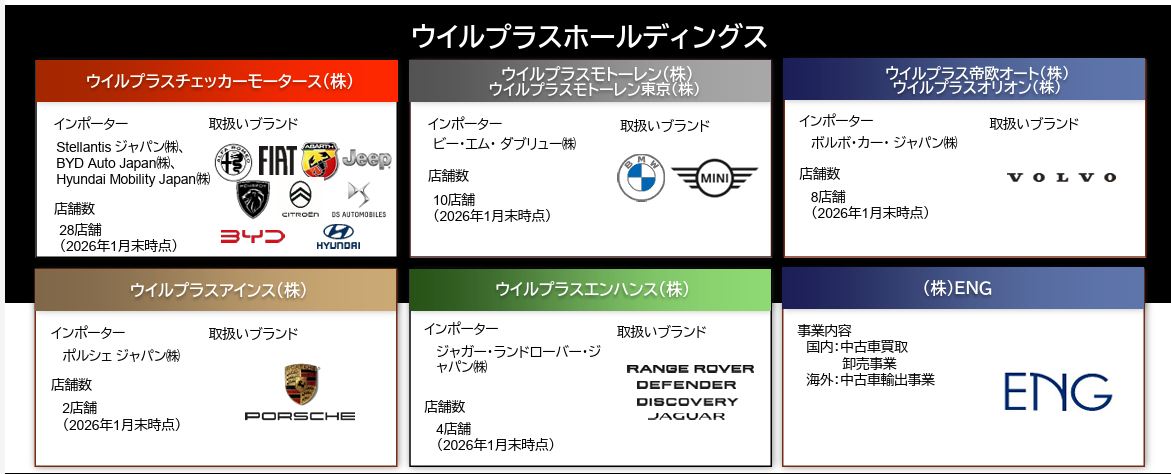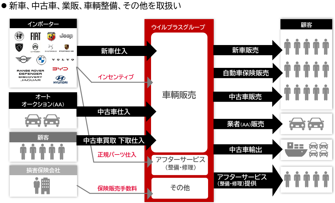 持株会社である(株)ウイルプラスホールディングスの下、連結子会社8社において輸入車の新車及び中古車の販売、車輌整備、損害保険の代理店業務、中古車輸出などを展開している。取扱ブランド数は17ブランド。取扱うブランドごとにインポーター(日本国内で輸入車を取り扱う業者)と正規ディーラー契約を締結している。