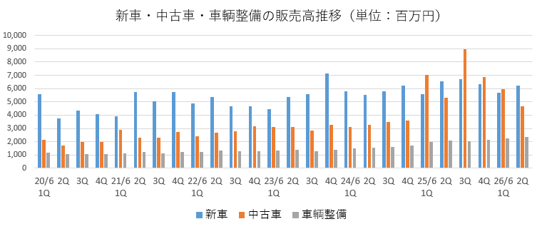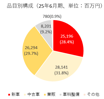売上高の品目として、新車、中古車、業販、車輌整備、その他を決算短信で開示している。中古車販売の国内外内訳の開示も行っている。