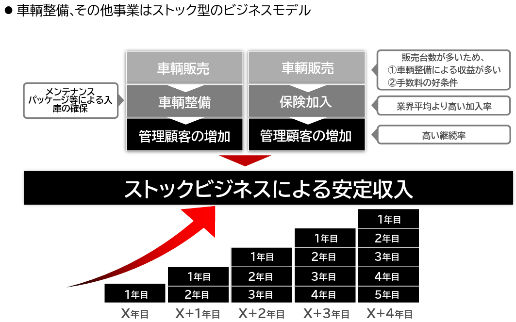 ストックビジネスと位置づけている車輌整備と保険販売による安定収益構造も同社の大きな特徴・強みである。