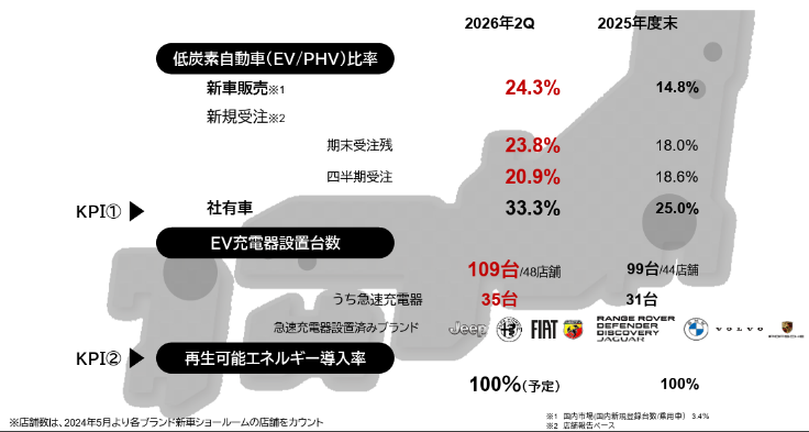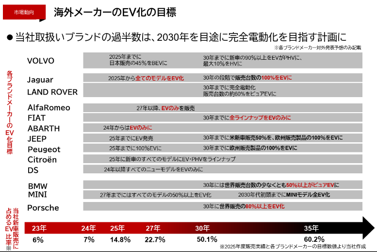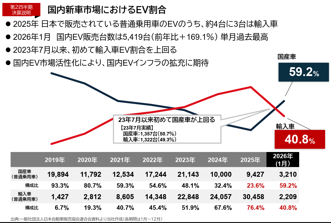 輸入車メーカーは、環境課題への対応に積極的で、同社取り扱いブランドの過半数は、2030年を目途に完全電動化を目指す計画を発表している。一方、日本メーカーは、EVの目標販売台数や目標販売比率は出すものの、海外競合と比較すると拡大ペースは鈍いが、2026年1月には国内新車市場におけるEVの国産車シェアが輸入車シェアを上回った。これは2023年7月以来のことである。国内EV市場の活性化によるインフラの拡充が期待される。