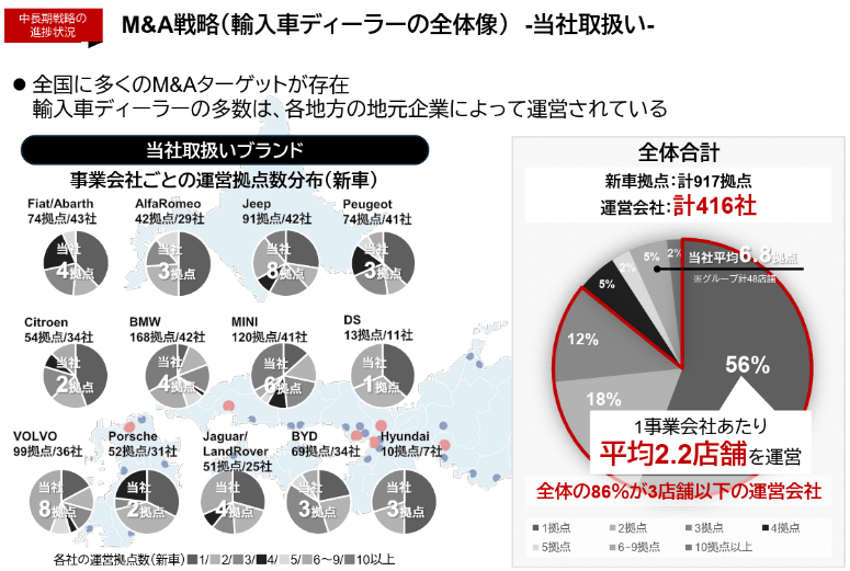 JEEP、BMW、MINI、VOLVOなど17ブランドを取り扱う輸入車正規ディーラー7社、中古車買取卸売及び輸出を行う1社を連結子会社とする持株会社。顧客満足度の向上に注力し、マルチブランド戦略、ドミナント戦略、M&A戦略による成長を追求している。M&Aにおける事業再生能力には大きなアドバンテージを有する。EV化の進展を始めとした自動車を取り巻く大きな環境変化を好機ととらえ、更なる成長を目指す。