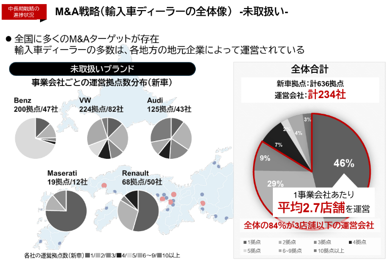 「販売台数増=フロー収益の拡大」に加え、M&Aによる店舗数増大が「車輌整備件数増、保険加入件数増」というストック収益の拡大に結び付いている。