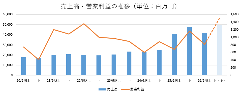 - 26年6月期上期の売上高は前年同期比2.5%増の420億96百万円。中古車市場における需要の増加及びサービスネットワークの拡充が寄与した。営業利益は同18.8%増の8億13百万円。前期M&Aした子会社の収益改善などで売上総利益は増収率を上回る同7.1%増。売上総利益率は同0.6pt上昇した。人件費、地代家賃、減価償却費など販管費も増加したが、これを吸収。前年同期に発生した特別調査関連費用の剥落等も寄与した。