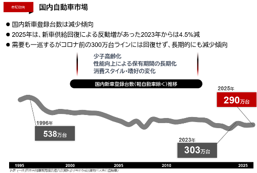 少子高齢化の進行、自動車の性能向上による保有期間の長期化、消費スタイルや嗜好の変化(=いわゆる若年層の「車離れ」)などにより国内新車登録台数は減少傾向にある。