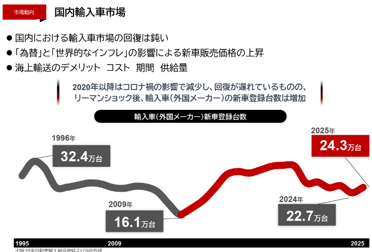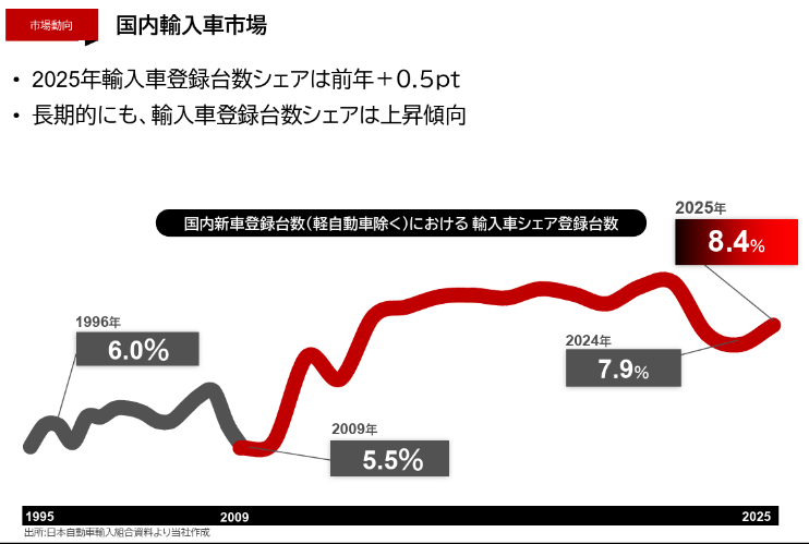 同社では、輸入車新車マーケットは2025年で1.75兆円と推定している。国内乗用車市場(軽自動車を除く)における輸入車シェアは長期的には増加傾向にあると同社は考えており、M&A戦略によりシェア拡大を進めることで、収益の一段の拡大を追求する考えだ。