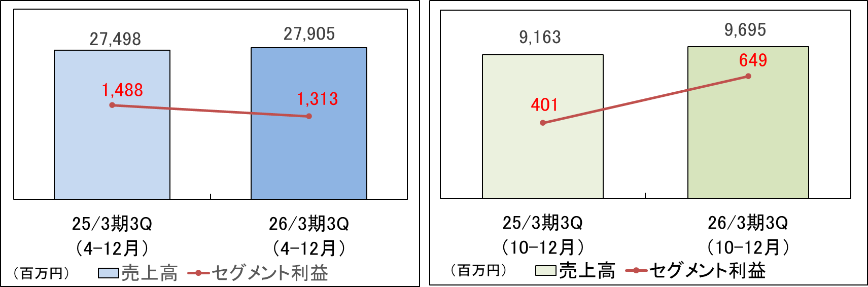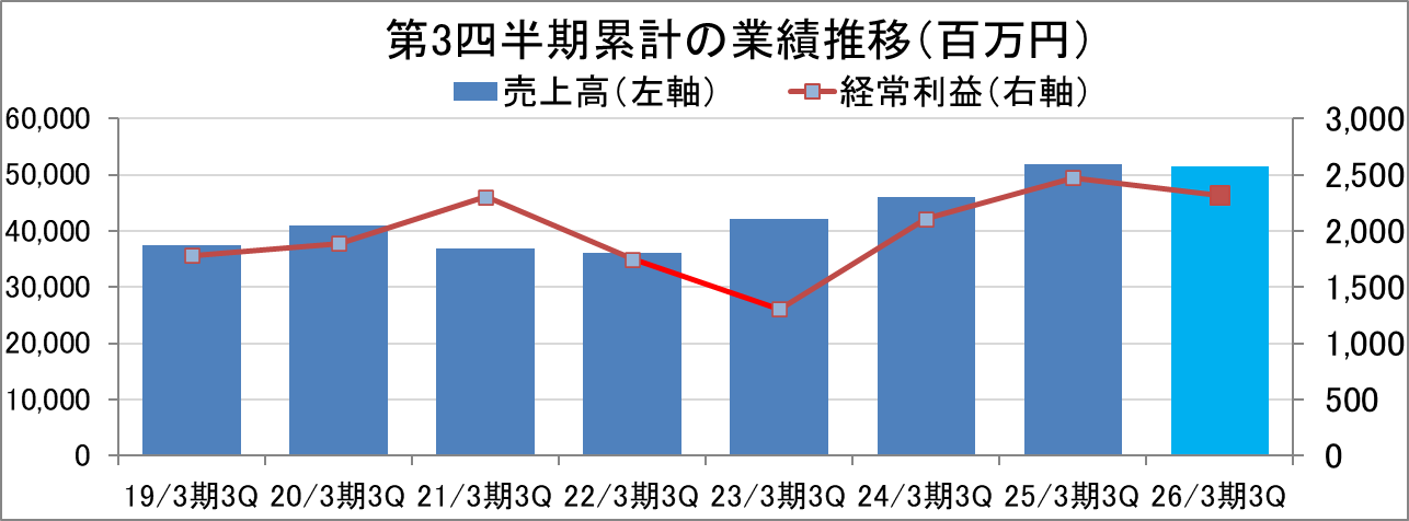 26/3期第3四半期(10-12月)は、㈱エルコムが新紙幣発行に伴う特需の反動で減収となったものの営業増益となった。過去の第3四半期(10-12月)と比較しても高水準の営業利益となった