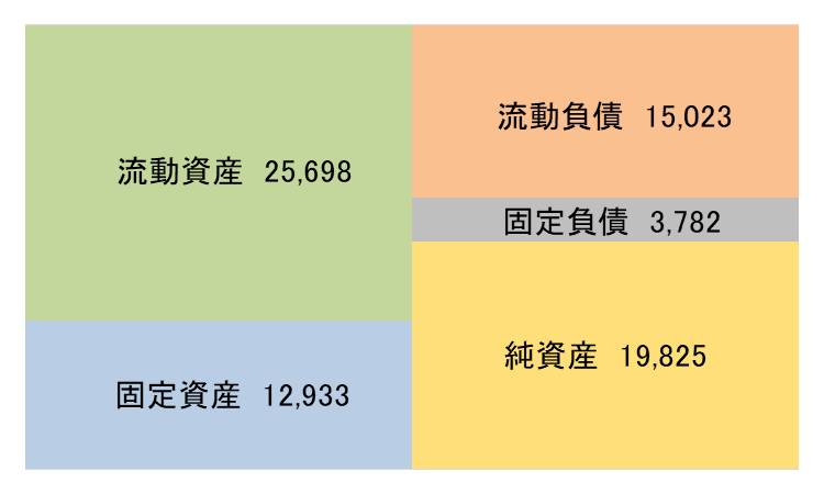 有形固定資産 | 2,608 | 2,672 | 負債 | 22,425 | 18,806 |