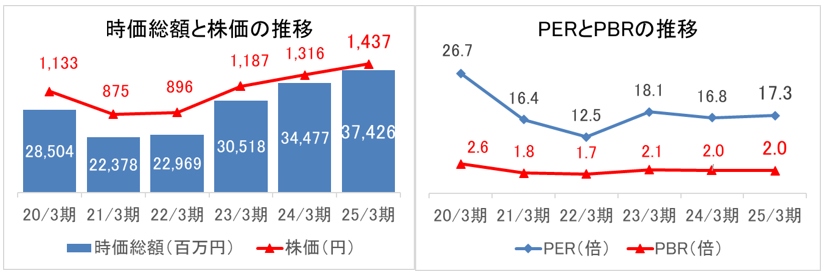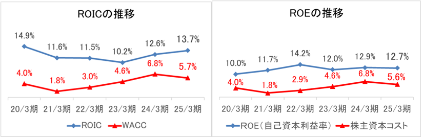 25/3期のROICは、可視化伴走型経営支援事業(アイコンサービスなど)が順調に進展したことなどによる営業利益の増加により前期比1.1ポイント上昇した。同社は、中小企業のESG経営支援の伴走型アドバイザーとして確固たる地位を確立すべく今後も投資を強化する方針である。それにより常時資本コストを上回る水準で資本収益性を維持し、継続的に向上することを目指す。