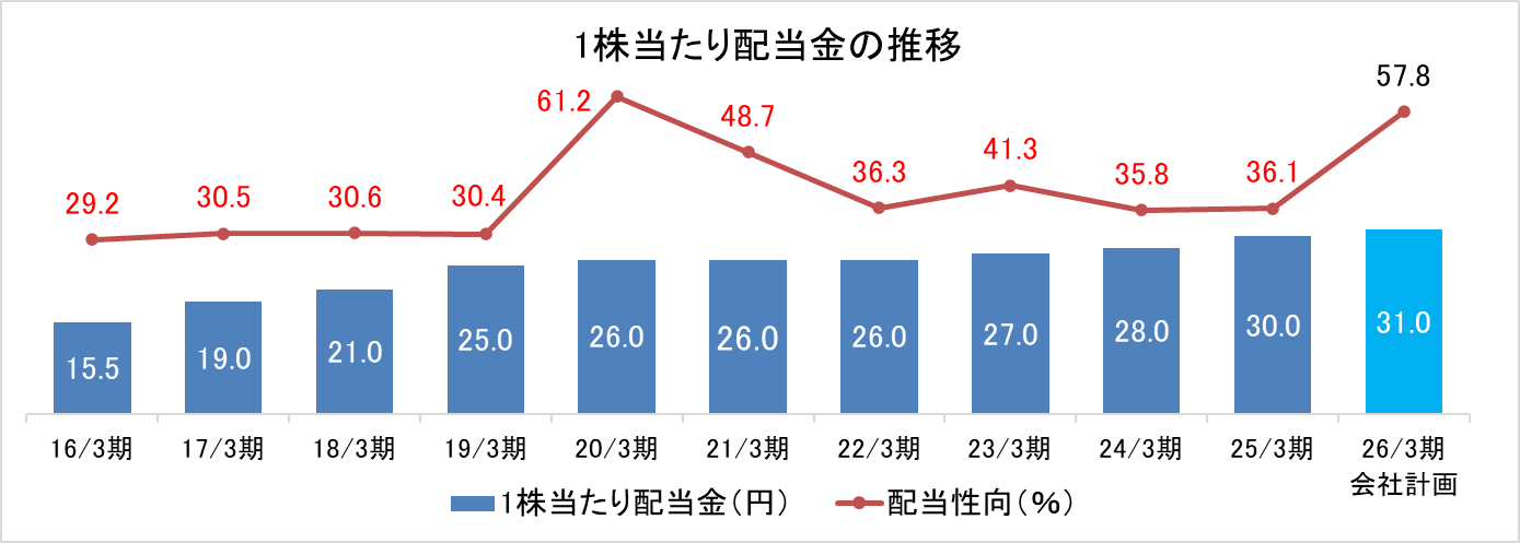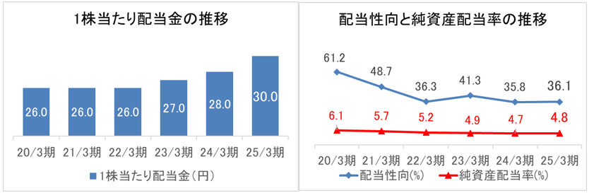 同社は、配当による株主への利益還元を重要な経営課題のひとつと認識している一方で、今後の事業計画、財務状況等、中長期的観点から内部留保と安定した成果配分、双方のバランスにも配慮して配当金を決定している。25/3期の1株当たり年間配当金は、この方針を踏まえ、前期と比較し2円増配の30円とした。