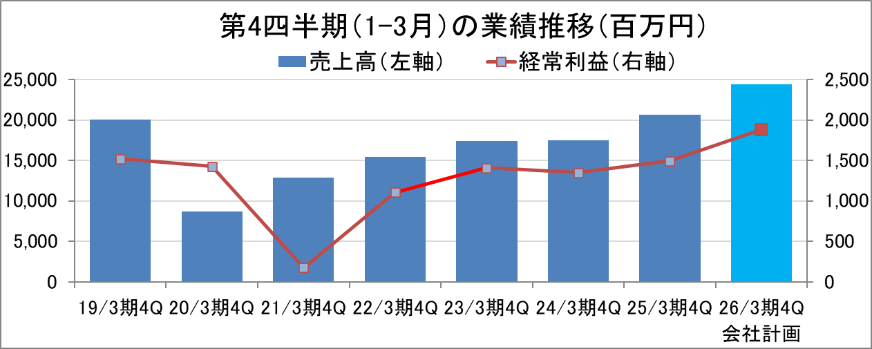26/3期第4四半期(1-3月)は、前年同期比18.3%の増収、同25.4%の経常増益の会社計画となっている。また、経常利益率は7.7%と前年同期比で0.5ポイント上昇する見込みである。