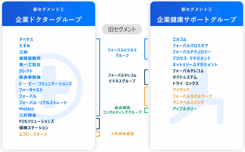 同社は、27/3期に成長戦略に沿った形で企業ドクターグループと企業健康サポートグループの2つのセグメントへの変更を予定している。
