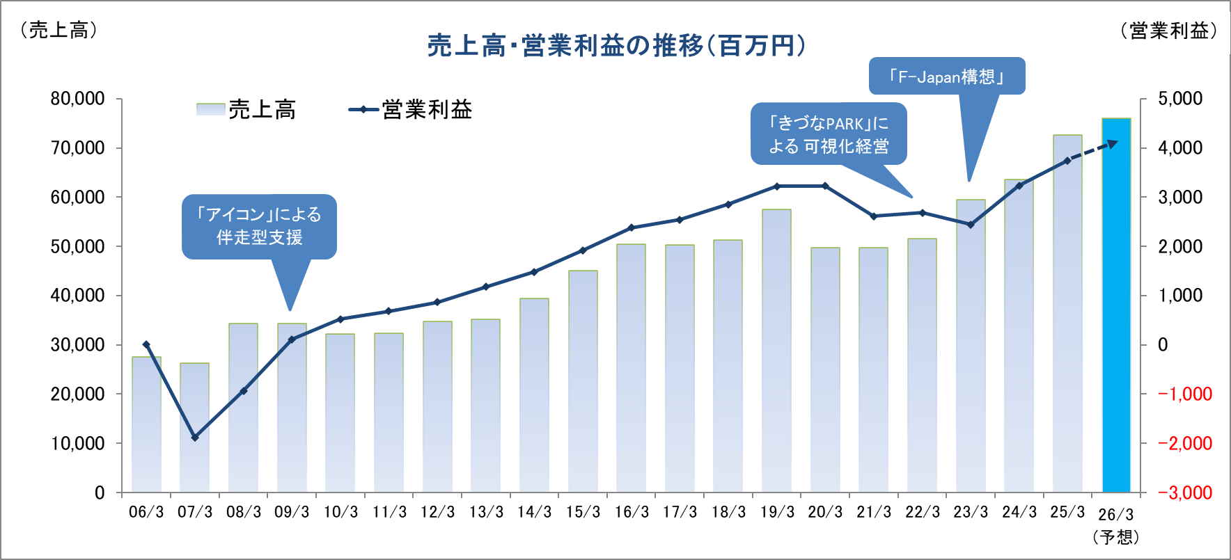 企業ドクターによる伴走型支援、「きづなPARK」による可視化経営、「F-Japan戦略」をドライバーに、業績は拡大基調。
