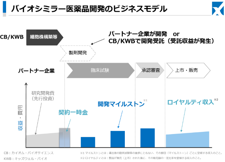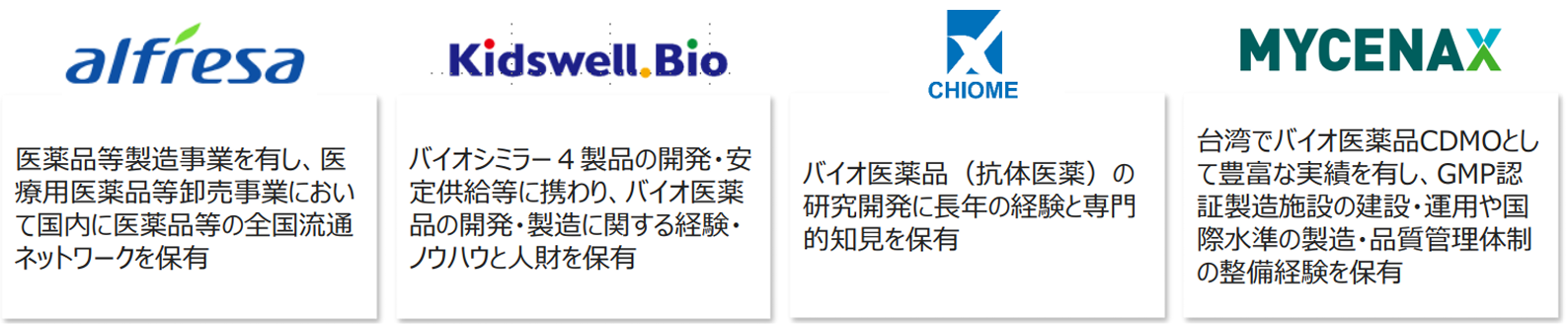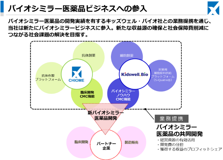 - 「バイオシミラー医薬品事業」に関し、バイオシミラー医薬品の原薬・製剤製造を行う合弁会社の設立が決定したほか、カイオム・バイオサイエンス、アルフレッサ ホールディングス、キッズウェルの3社でバイオシミラー医薬品開発に関する基本合意書と個別製品の共同開発のための基本契約書を締結した。製造施設の整備完了後、新規バイオシミラー医薬品の製造を移管することを想定しており、現在の委託先であるMBIと連携することで、スムーズな技術移管と稼働、バイオシミラー医薬品の安定供給体制構築を実現する。新規開発から製造・供給までをカバーする国内初のバイオシミラー医薬品のサプライチェーン構築と安定供給の実現にむけた取り組みをさらに推進する考えだ。
