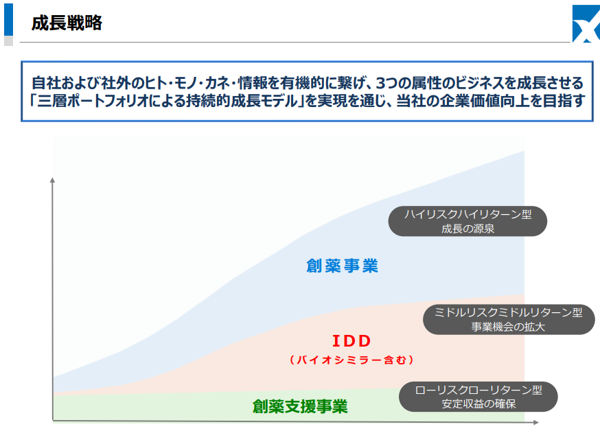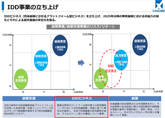 エクイティによる資金調達に過度に依存しない経営を目指し、インテリジェンスを活かした新事業であるIDDビジネスやバイオシミラー事業を推進することで収益性を高め、経営の安定化および企業価値の増大を図る考えだ。