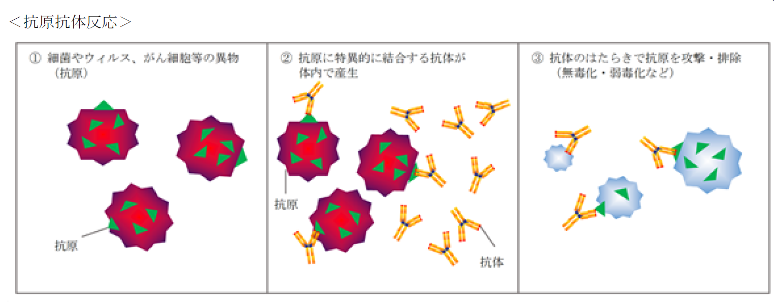 ヒトには、体内に侵入した細菌やウイルス等のタンパク質を異物(抗原)として認識し、その異物を攻撃、排除するために、体内で抗体を作って身体を守る防御システムが備わっており、これを「抗原抗体反応」と呼ぶ。