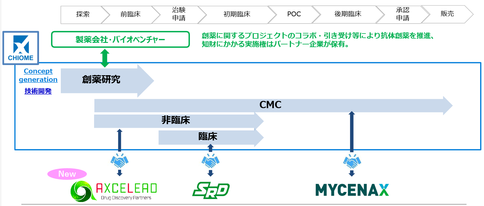 医薬品の研究開発プロセスのうち、「抗体の作製・評価」「開発・製造」「臨床試験の一部」を事業範囲としている。