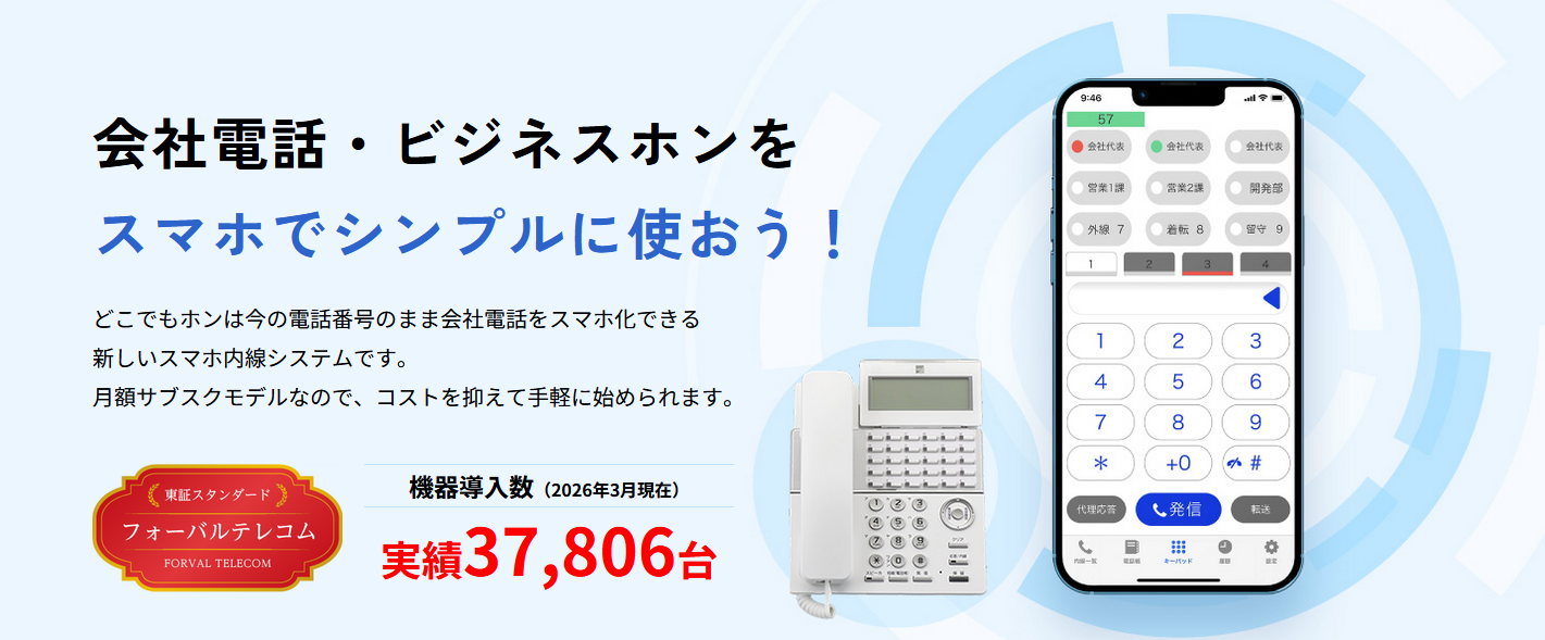 どこでもホンには、①外出先から会社番号で通話が可能、②会社宛の電話を外出先でも受けられる、③スマホと内線通話が可能(パケット定額で通話無料)、④外線ボタン搭載(ページ切替で24ボタンまで表示)の4つの特徴がある。人手不足解消(外にいる人も会社宛の電話に出れる)、生産性向上解決(会社の電話番号通知ができるので、事務所に戻る必要がない)、長時間労働解決(顧客に通知するのは会社の番号)、働きやすい職場の構築(スマートフォン【iPhone】で、テレワークや働き方改革の強い味方)を可能にする優れたツールである。