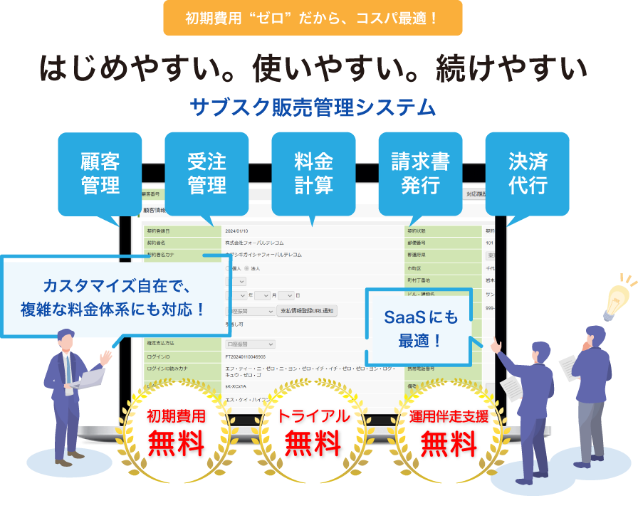 CollaboOneは、サブスクリプションビジネス管理に必要な機能をワンストップで提供する「クラウド業務管理サービス」である。導入企業は、顧客・受注管理、月々の料金計算、請求、決済代行まで、あらゆる業務をクラウド上で一元管理・自動化することで大幅な業務効率化が図れ、生産性向上とサービスの持続的な成長を加速することが可能となる。また、インボイス制度に対応した消費税額の計算や、適格請求書の発行も可能。