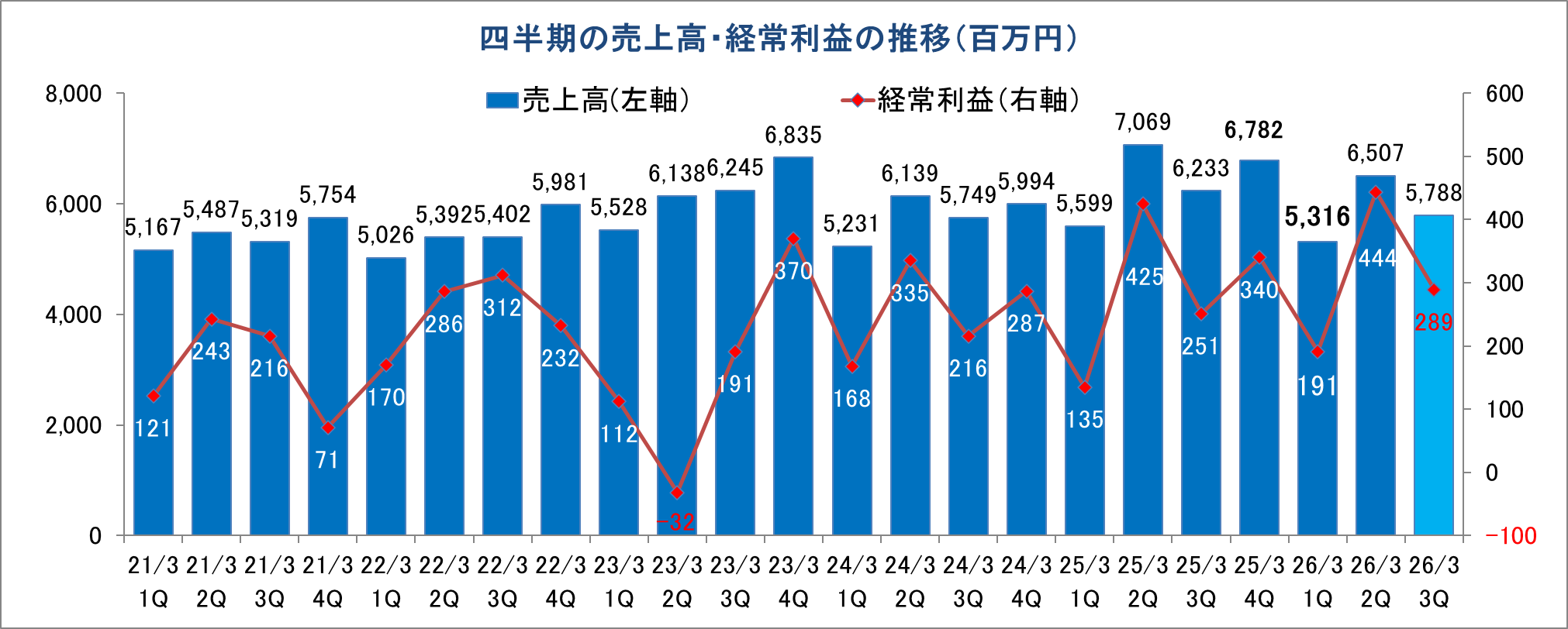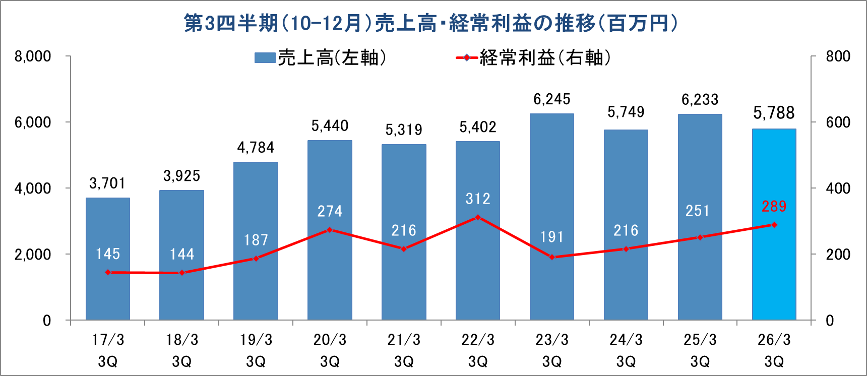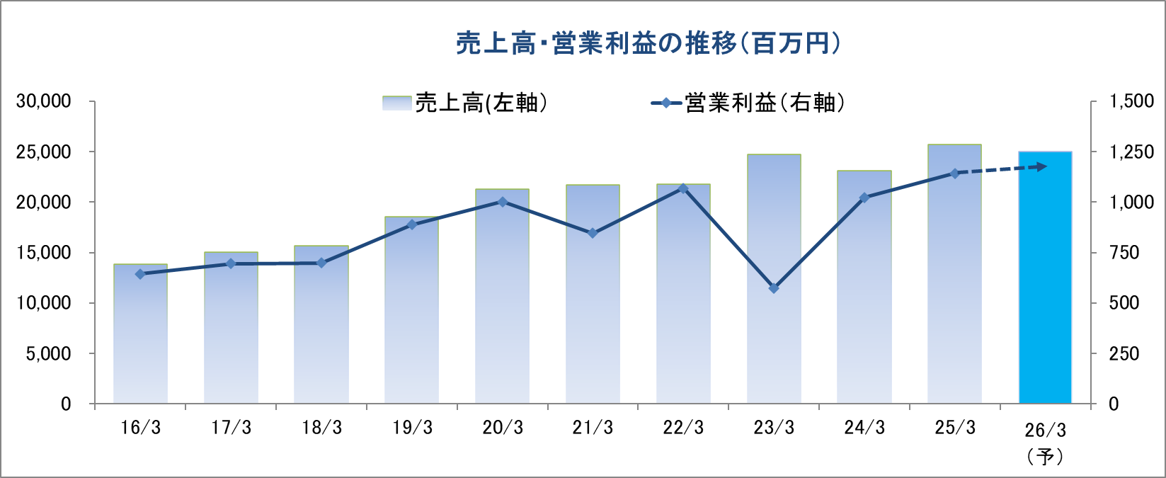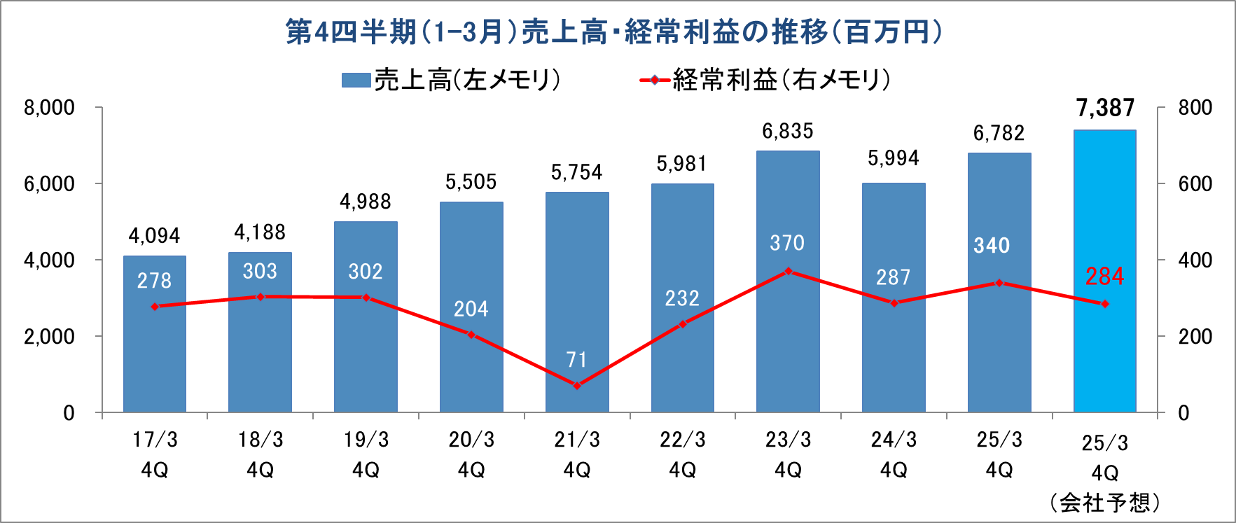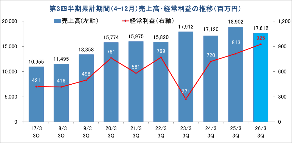 26/3期第4四半期(1-3月)の会社予想は、前年同期比で8.9%の増収ながら同16.3%の経常減益の保守的な計画となっている。