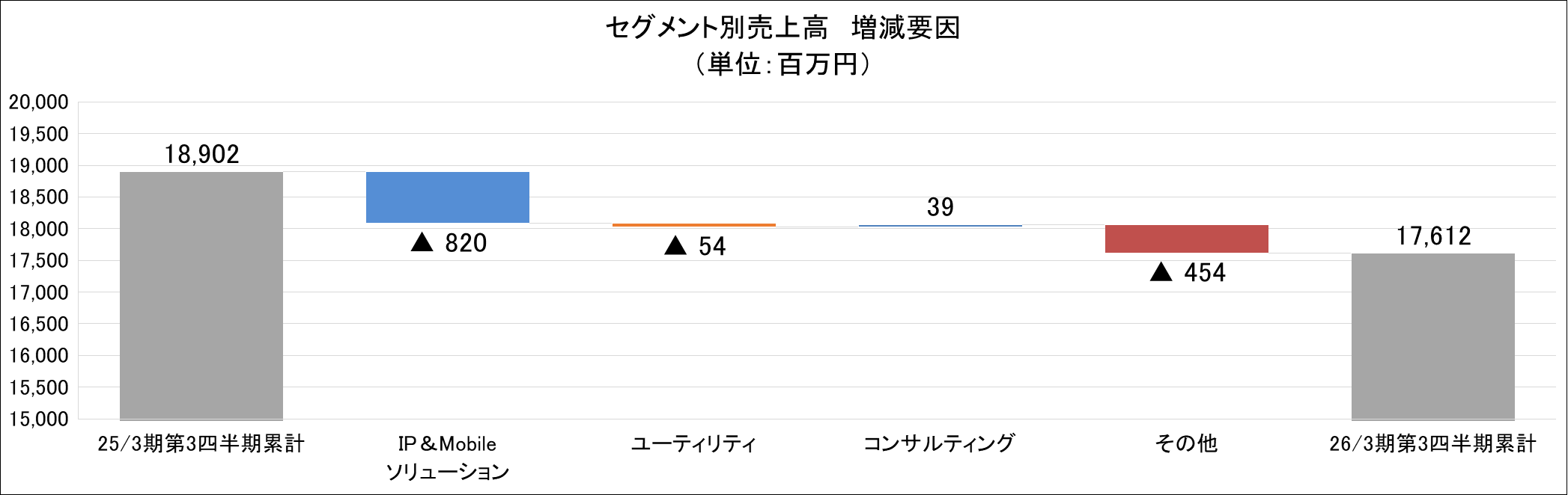 同社の26/3期第3四半期累計の決算は、前年同期比6.8%の減収ながら、同13.8%の経常増益となった。売上高の減少については、トライ・エックスおよびFISソリューションズが連結対象外となることが影響したものであり致し方ないことである。ユーティリティ・ビジネスでは、調達価格と連動する売価の引き下げにより、前年同期で売上高が微減となったものの契約件数の堅調な伸びによりセグメント利益は同21.3%の増益となった。コンサルティング・ビジネスでも、コンテンツソリューションとDXコンサルティングの販売計画に遅れが生じたものの、保険サービスとクラウドサービスの伸長より、売上高は前年同期比1.5%の増加、セグメント利益は同184.5%の大幅な増加となった。IP&Mobileソリューション・ビジネスにおいて、連結子会社の除外および個人サービスの利用件数の減少等により減収減益となったことは残念ではあるが、ユーティリティ・ビジネスとコンサルティング・ビジネスがカバーし、成長トレンドが鮮明になってきたことが確認された。順調な第3四半期累計の決算を受けて通期会社予想に対する進捗率は売上高で70%、各段階利益も76%前後となっている。同社の業績は第4四半期の比重が大きくなる傾向を踏まえると、通期会社予想の達成に向け順調な進捗と言えよう。また、第4四半期(1-3月)は前年同期比で増収減益と収益性が悪化する会社予想となっている。来期の成長に向けどこまで出発点を引き上げることができるのか続く第4四半期の業績動向が注目される。こうした一方で、IP&Mobileソリューション・ビジネスでは減収減益傾向が続いている。残念ながら通話系ストック収益とネット系ストック収益の減少に底打ちが見られない。今後、いかなる施策によりIP&Mobileソリューション・ビジネスを成長トレンドへ転換させるのか注目される。